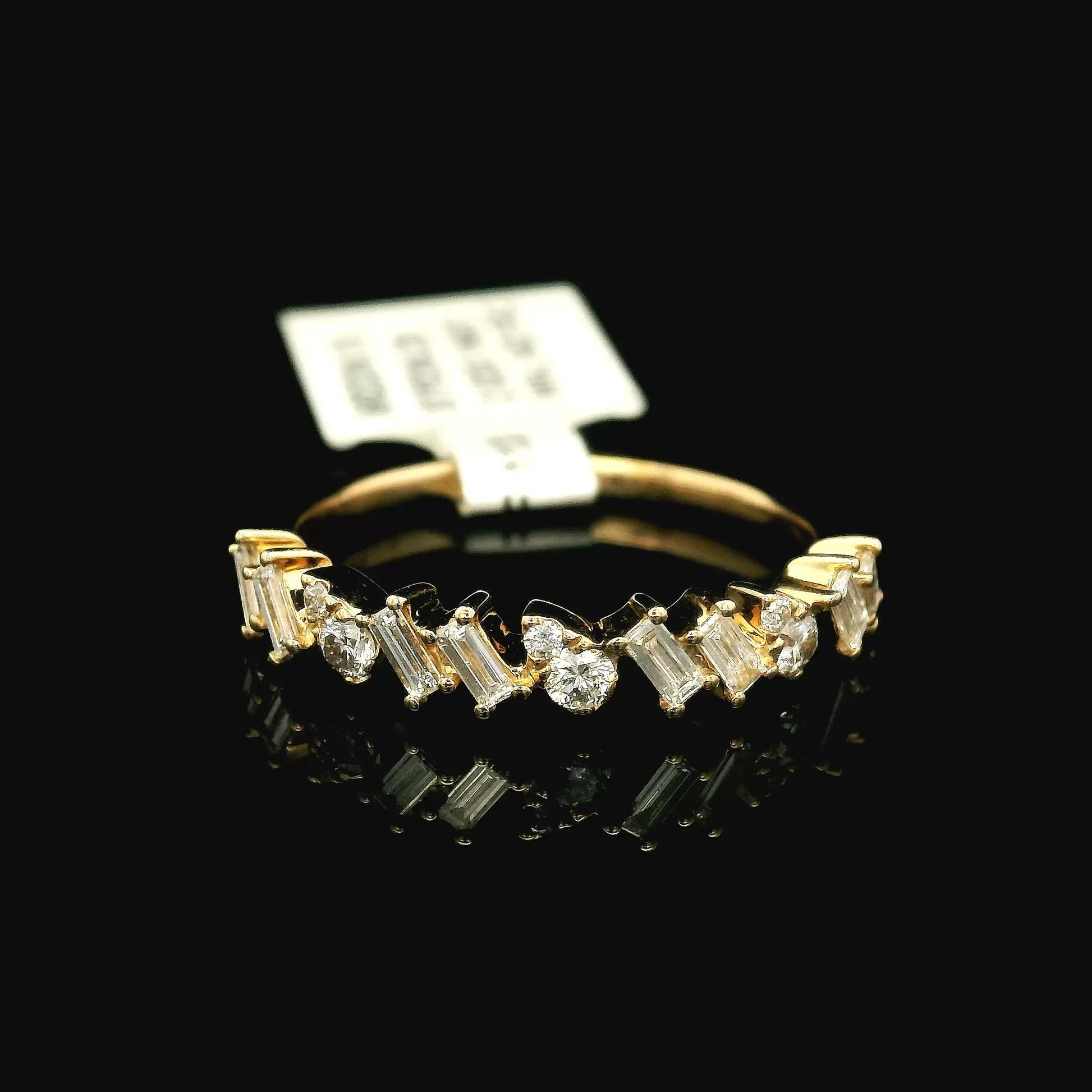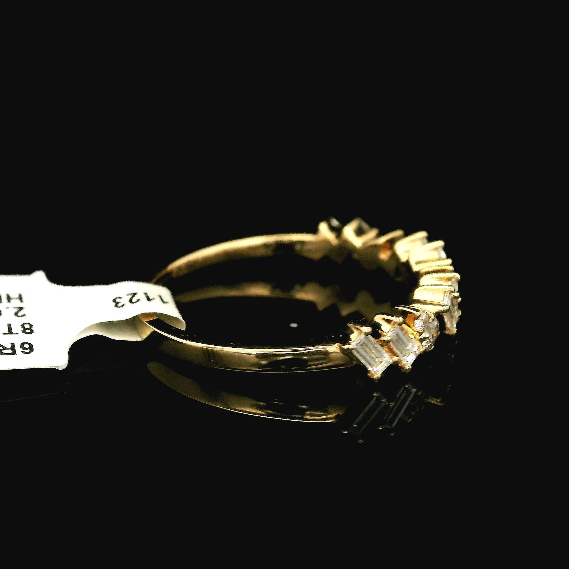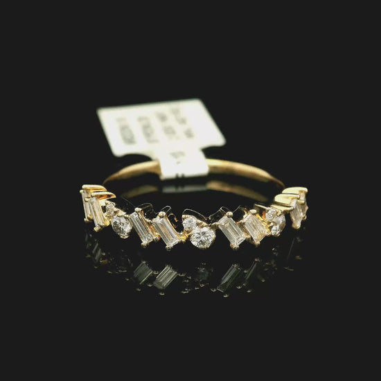 Elegantly crafted band featuring a meticulously arranged composition of round cut diamonds set in a lustrous yellow gold base with straight baguette cut diamonds. This sophisticated piece exudes a timeless charm and subtle brilliance, perfect for adding a touch of luxury to any ensemble.
